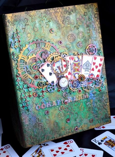Первая охххх огромная работа, была проделана, заказная. Сделана в стиле микс медиа книга-шкатулка. Использовала деревянную заготовку размером 30х9х20см , грунтовала, красила, наклеивала разные чипборды , накладывала пасту через трафарет опять красила, использовала спреи и патину. Больше намучилась с декором, так как надo была сделать работу в подарок игроку в покер. Нашла пластиковые карты, так как бумажные размокали, остальные детальки уже добавляла чтоб создать общую компoзитцию.